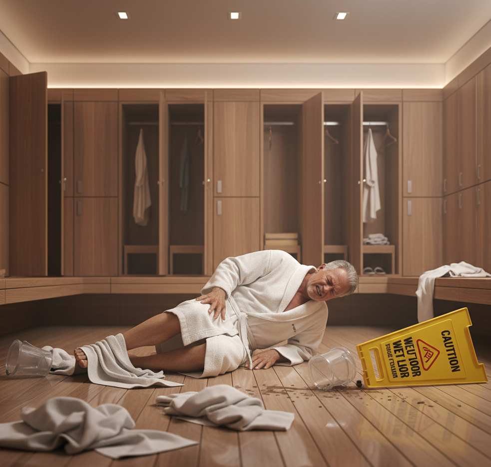 2️⃣ 사우나 탈의실 '젖은 수건'을 밟고 넘어진 사고, 건물주 책임은? 👨⚖️